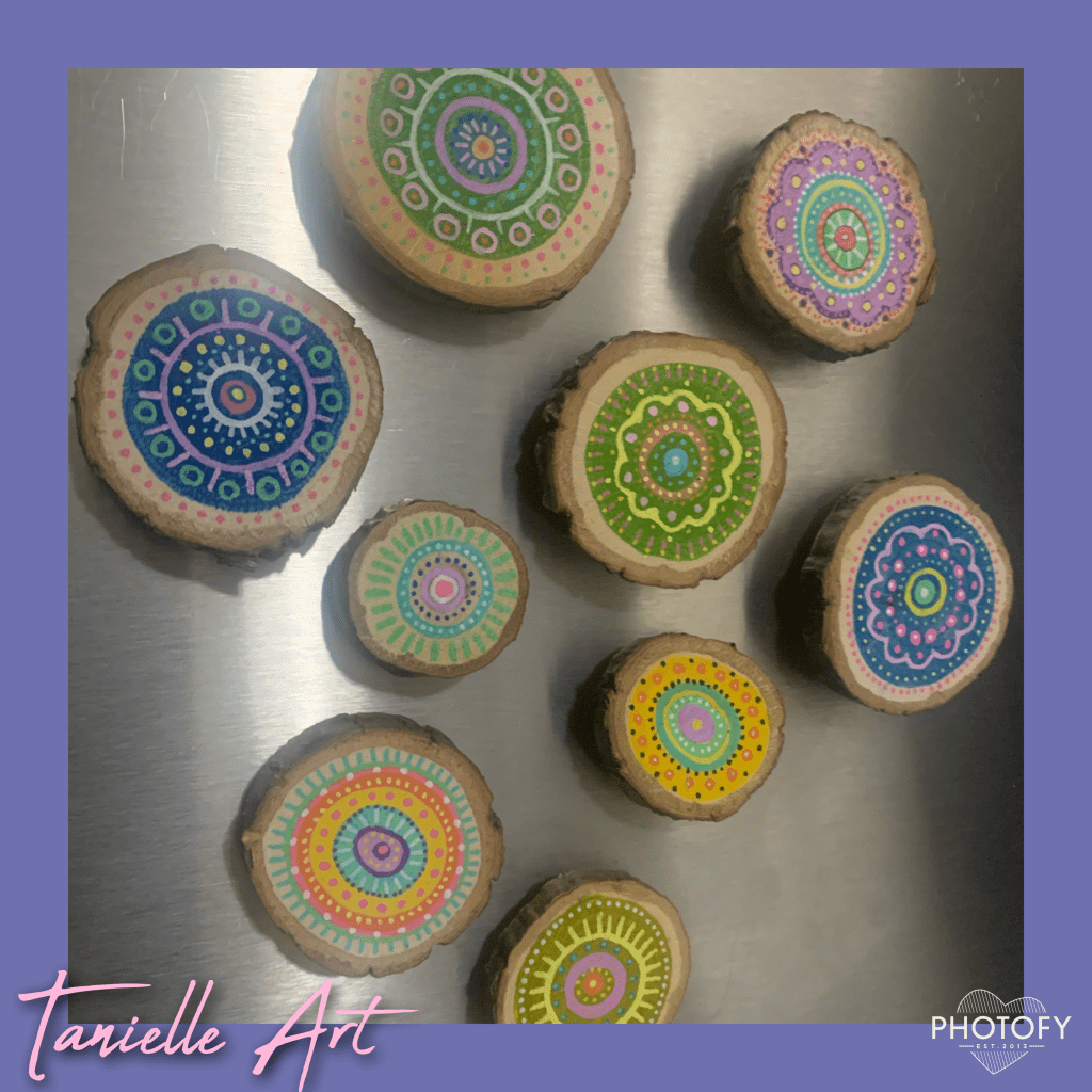 Two of my favorite things … nature and bright, happy colors! I have a bag of mini tree rounds and when our 2 year old tells me it’s time to ‘paint’ or ‘cu-yer’ (color) – she does her coloring and I paint my mini slices into these. Today the magnets arrived and the hand-painted mini tree slices came to life as really cool little magnets. I may not have loads of time to paint these days – but I get in what I can…when I can! These colors make my heart smile! And 2 year olds are the best!